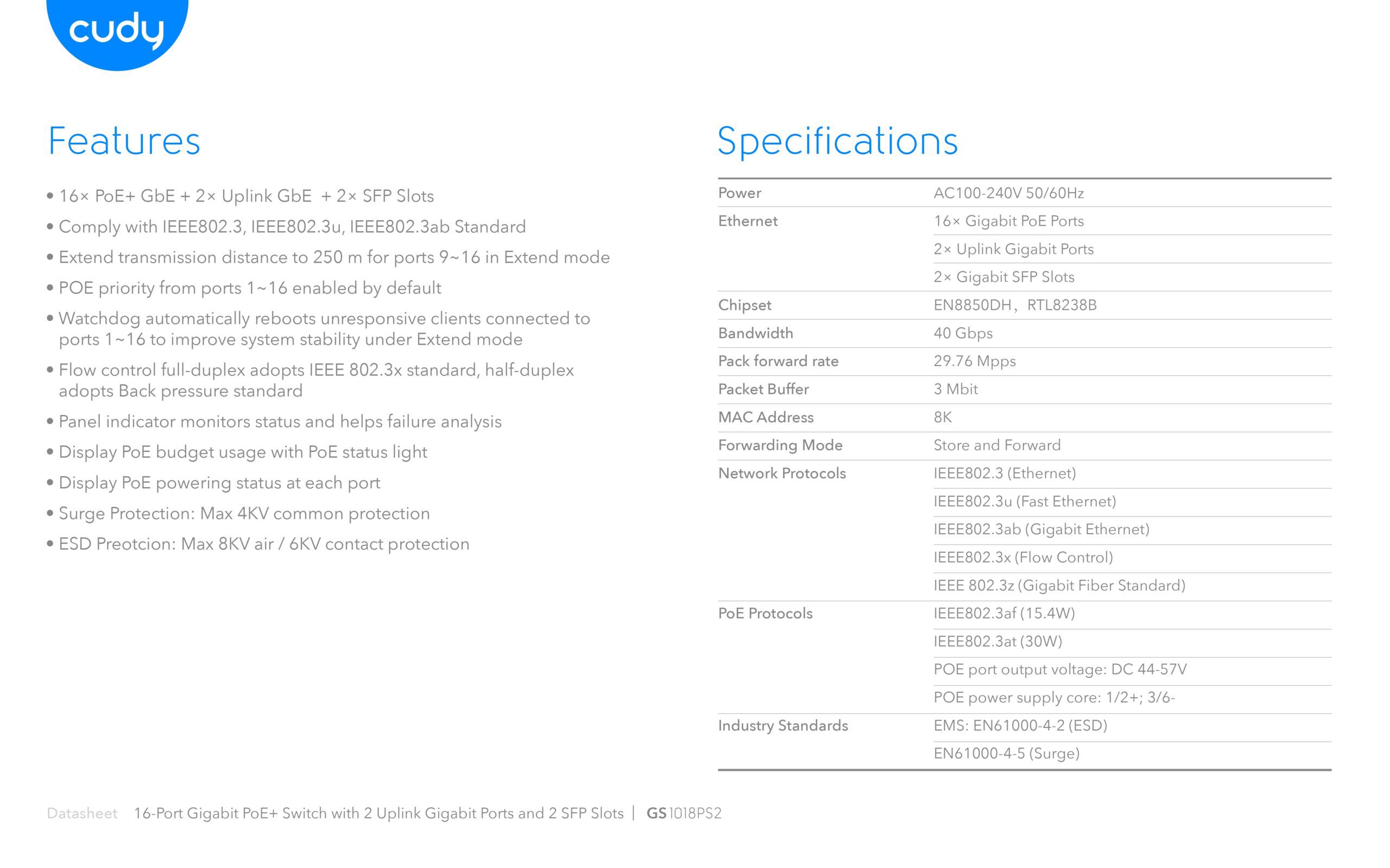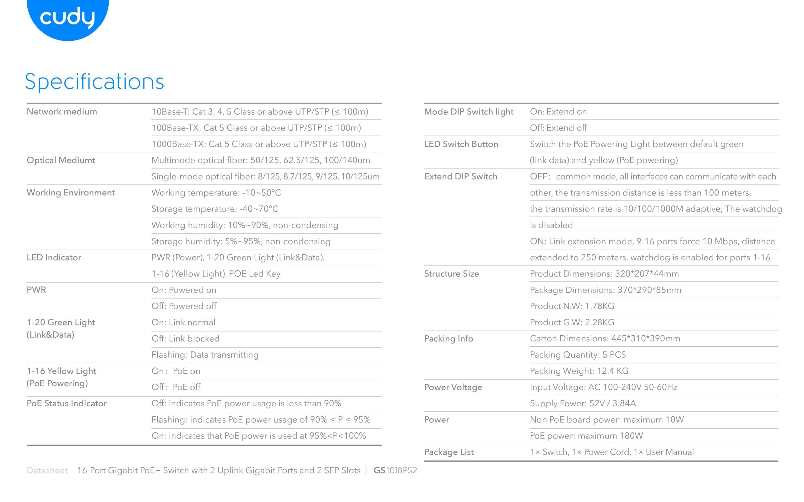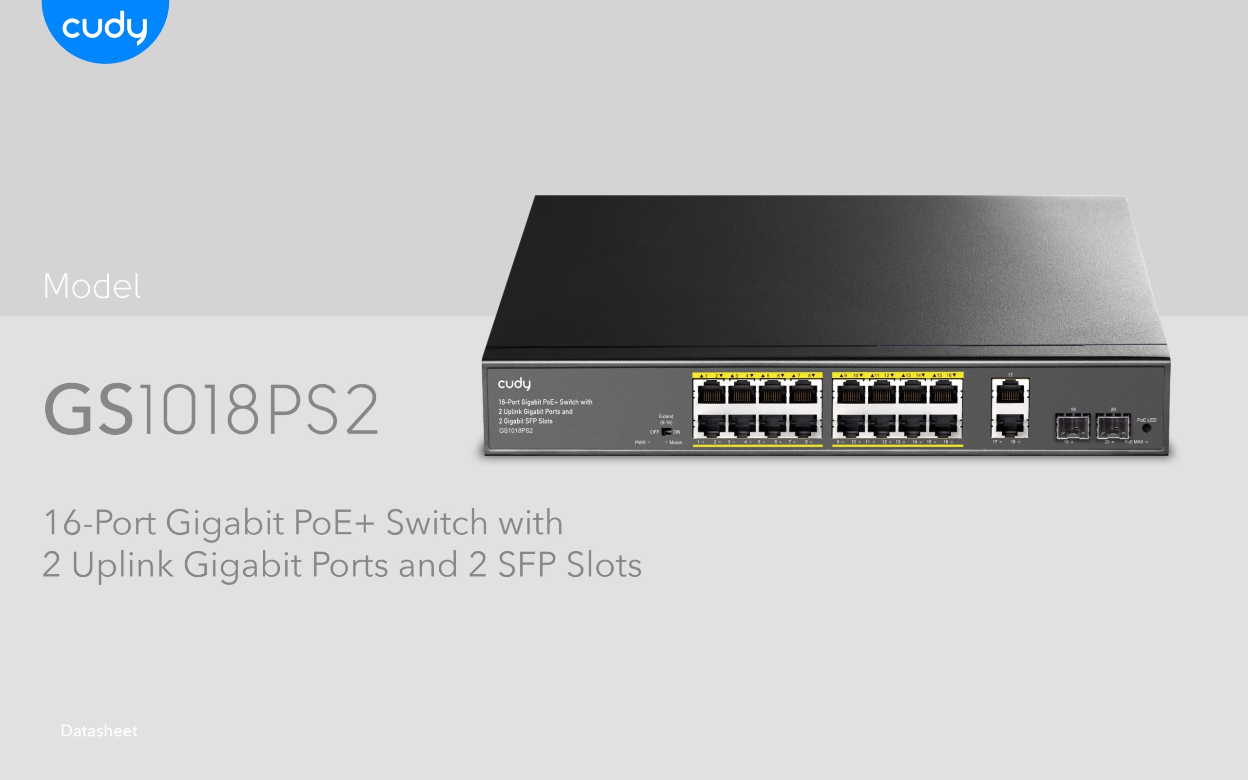 CUDY GS1018PS2 16-PORT GIGABIT PoE+ SWITCH +2 UPLINK GIGABIT PORT + 2 GIGABIT SFP PORTS,200W