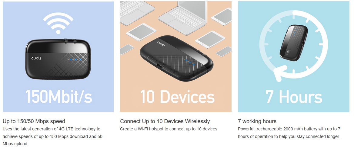 ● Share 4G connection with up to 150/50 Mbps (download/upload)