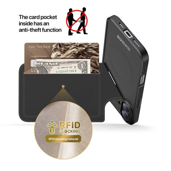 The Dux Ducis Rafi II Mag case is an advanced solution for smartphones, compatible with MagSafe. It has two card pockets, a RAFID lock and an adjustable stand.