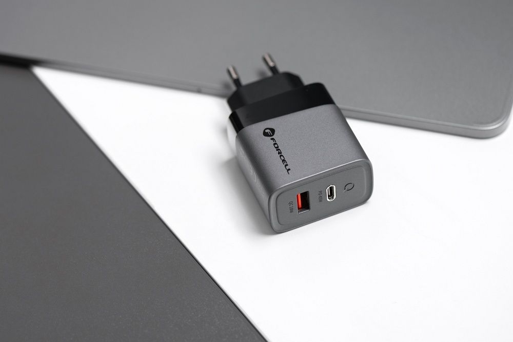 Forcell wall charger made with GAN technology, with a total power output of 45 W. It supports Quick Charge 4.0, Power Delivery and Super Fast Charging 2.0 charging standards and allows charging of phones and tablets as well as laptops. It features two ports – USB-A and USB-C.