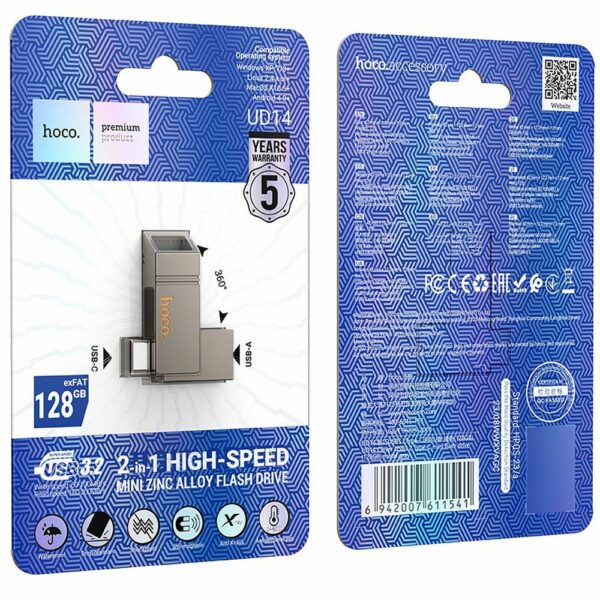 The HOCO UD14 pendrive with USB-A 3.2 Gen 1 and USB-C connectors with a capacity of 64 GB is a reliable and stylish solution for storing and transferring data. Thanks to its compact form and solid metal housing, the pendrive combines an elegant appearance with high functionality.