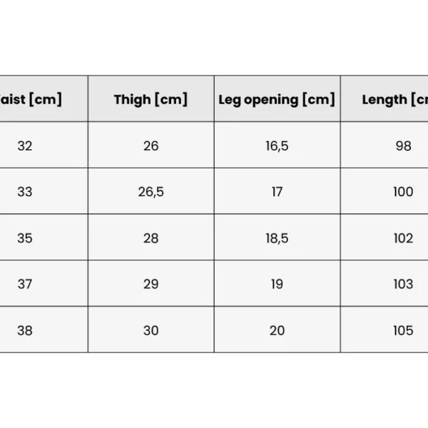 Size 1) External length (cm) 2) Inner length (cm) 3) Waist circumference (cm) 4) Thigh circumference (cm) 5) Calf circumference (cm)